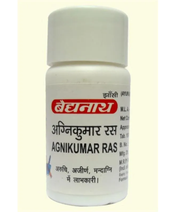 Baidyanath (Jhansi) Agnikumar Ras Tablet is a herbomineral Ayurvedic medicine containing purified mercury and sulphur, black pepper and many other ingredients. It is indicated for improving Agni or digestive fire to cure indigestion. Besides, it improves digestive function. This medicine is referenced from Ayurvedic treatise Bhaishajya Ratnavali. Agnikumar Ras shows beneficial effect in indigestion, malabsorption and constipation that occurs due to weakness of digestive fire. Its intake gives relief in heaviness in the abdominal region, gas, accumulation of stool inside the intestine, loose motions etc. In addition, Agnikumar Ras is indicated in Kapha-pradhan (kapha/phlegm dominant) and vata-pradhan (Vata dominant) indigestion. The main ingredient in this medicine is black pepper or Maricha due to which it is hot in potency. Therefore it is not recommended to use this medicine in indigestion with excess bile. If taken in Pitta-dominant indigestion, then due to excessive bile, a person feels burning sensation and uneasiness.